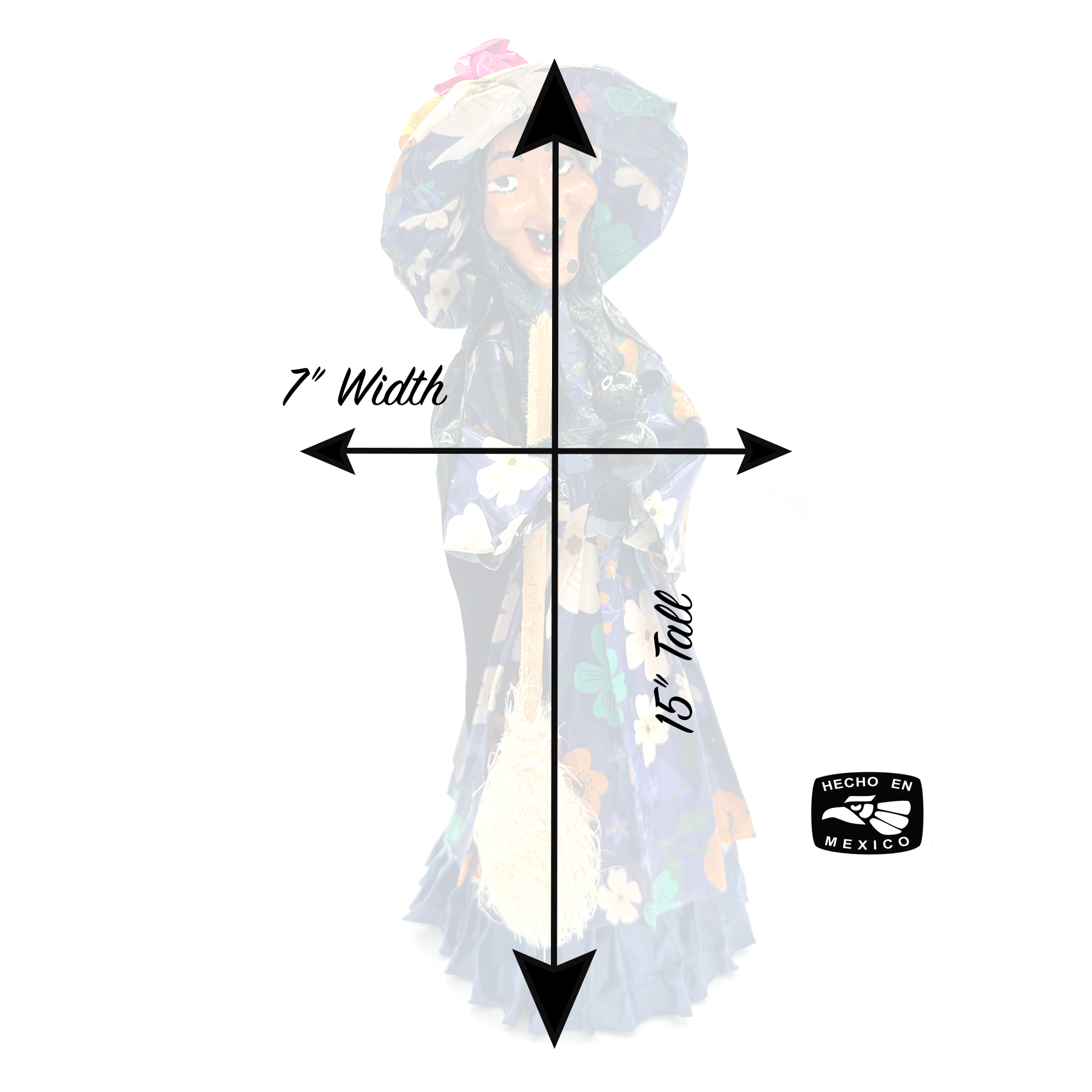 Use the dropdown menu to choose from various “bruja” designs. Your Catrina will be selected from our artisan-crafted inventory—each one full of personality and spellbinding charm.