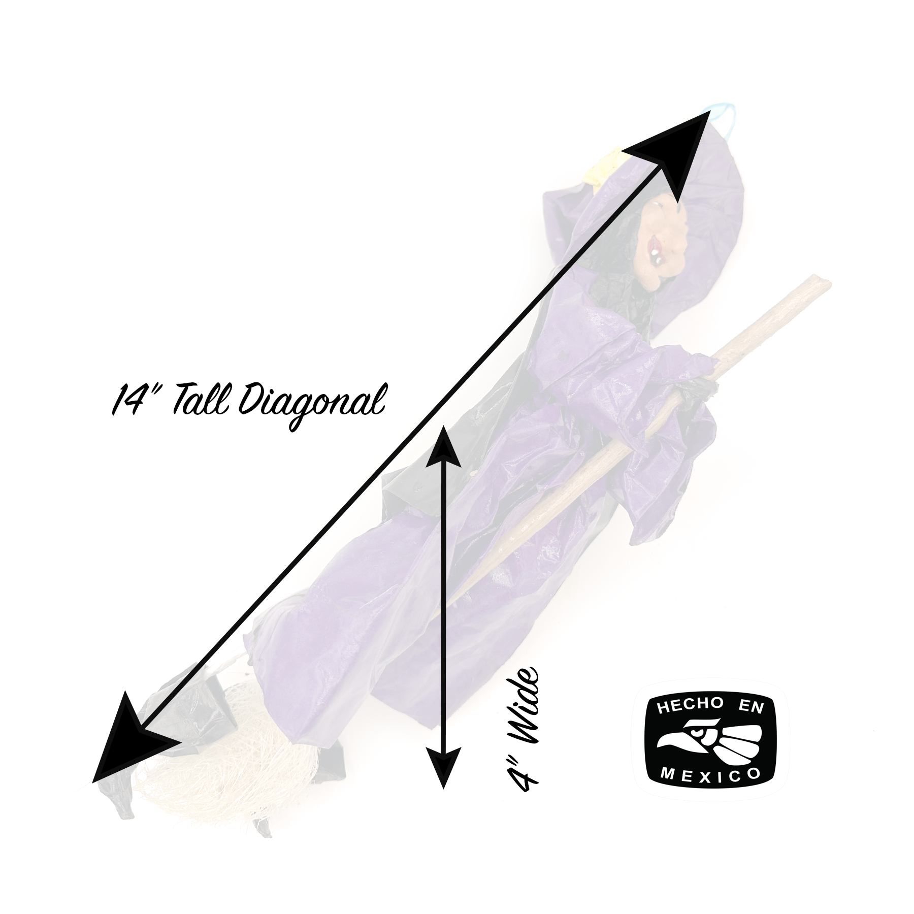 Design: Hanging, airborne witch-themed Catrina with broom; variants include cats, birds, and crystal balls