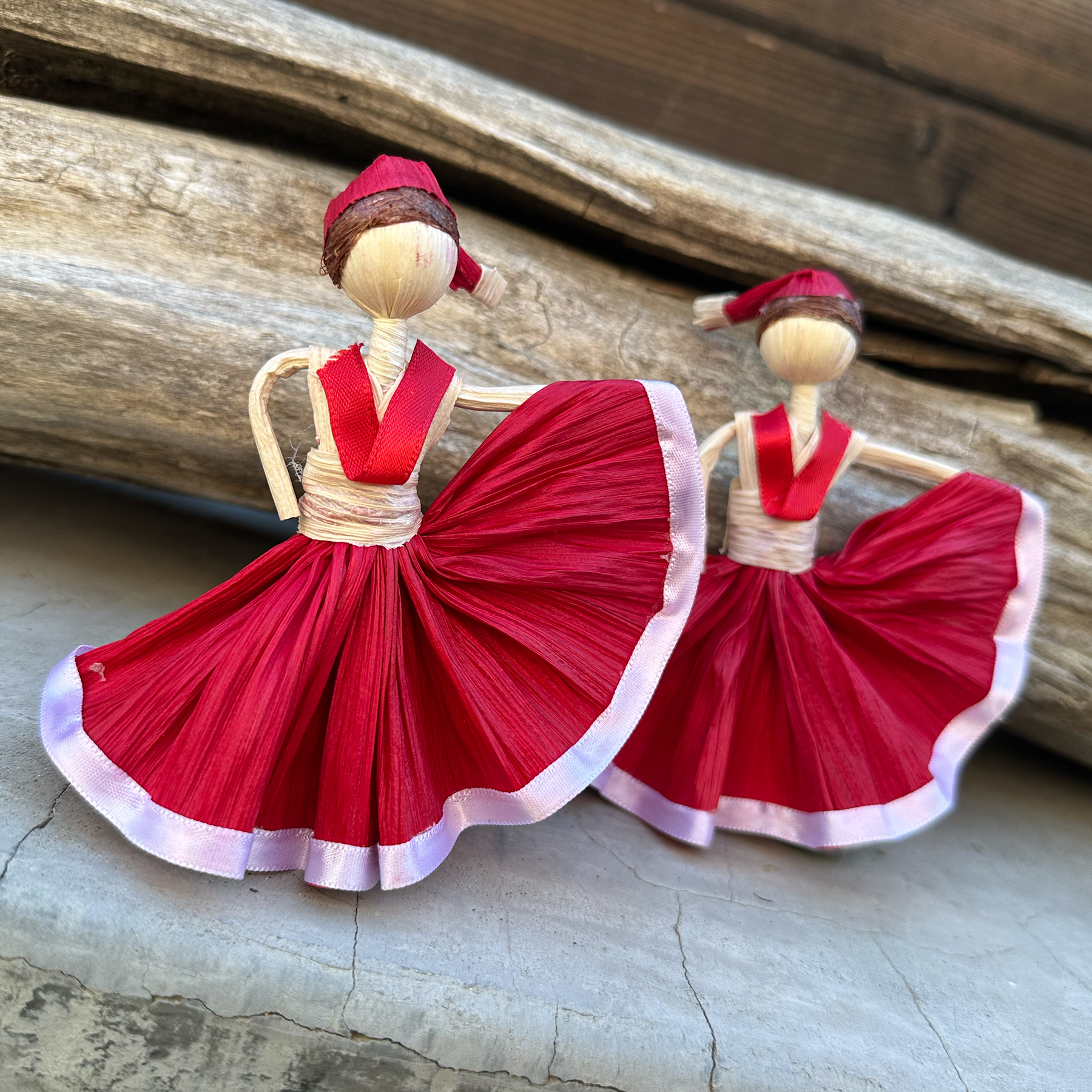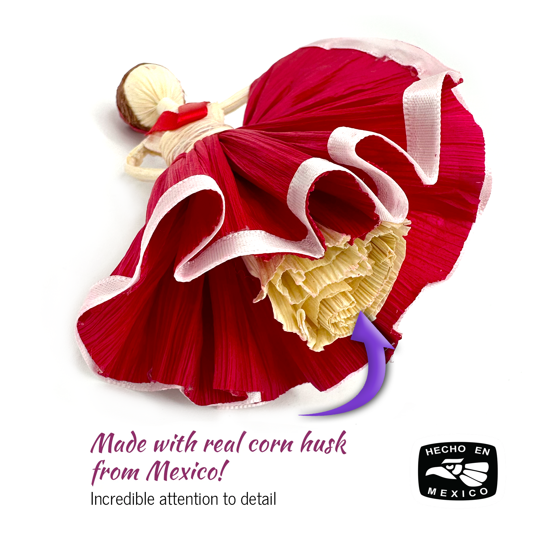 Celebrate the joy of the holiday season with a touch of Mexican tradition. This charming Christmas edition of our corn husk tamal doll embodies the spirit of folklorico dance, adorned in a rich red dress and a playful Santa hat. Handcrafted by skilled artisans in Mexico, each doll is a one-of-a-kind tribute to both cultural heritage and holiday magic.
