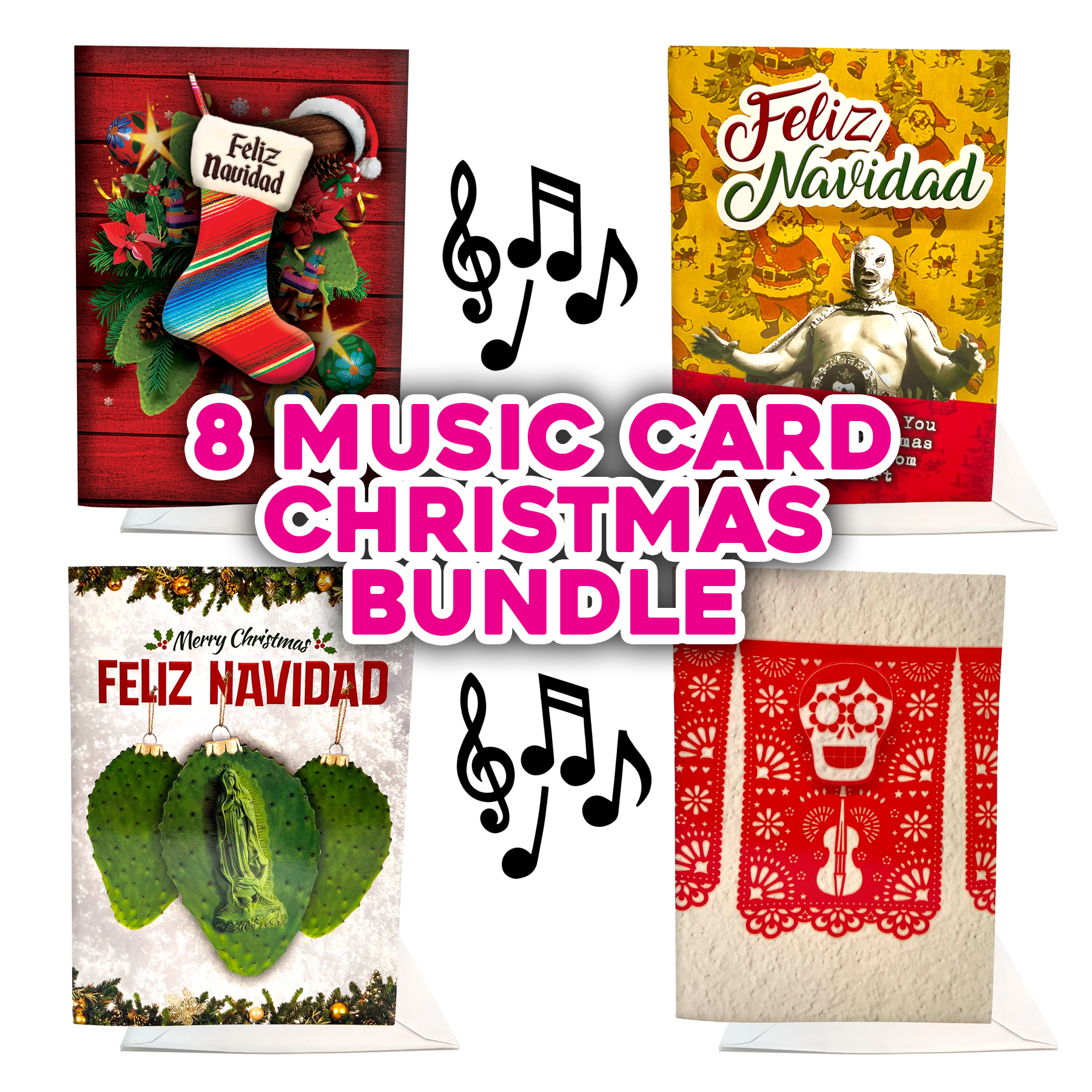 Infuse your holiday season with the warmth, nostalgia, and rhythm of classic Latin Christmas songs. This exclusive 8-card bundle brings together Muertolandia’s festive Dígalo Con Música series! Each card playing a beloved canción the moment it opens. Designed with vibrant Mexican iconography like papel picado, la Virgen, and luchadores, these cards are more than greetings, they're musical moments that transport us back to family gatherings, tamales in the kitchen, and songs echoing through the nochebuena air.