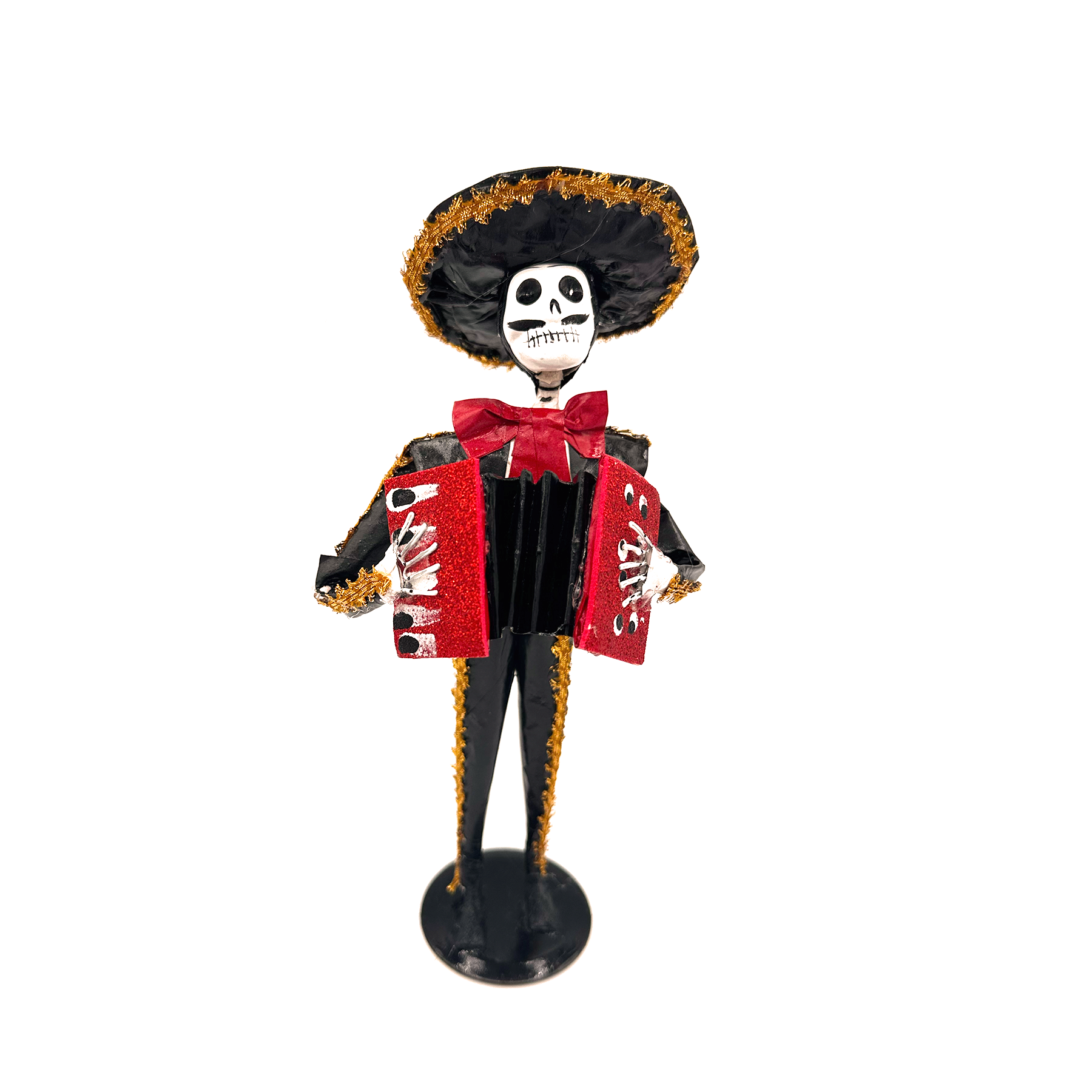 • Design: Catrín dressed in Charro suit with gold trim, red moño, and detailed accordion